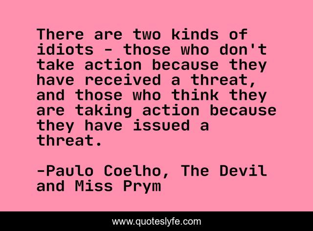 This page presents the quote "There are two kinds of idiots - those who don't take action because they have received a threat, and those who think they are taking action because they have issued a threat.". Author of this quote is Paulo Coelho, The Devil and Miss Prym. This quote is about action, threats, dichotomy,.