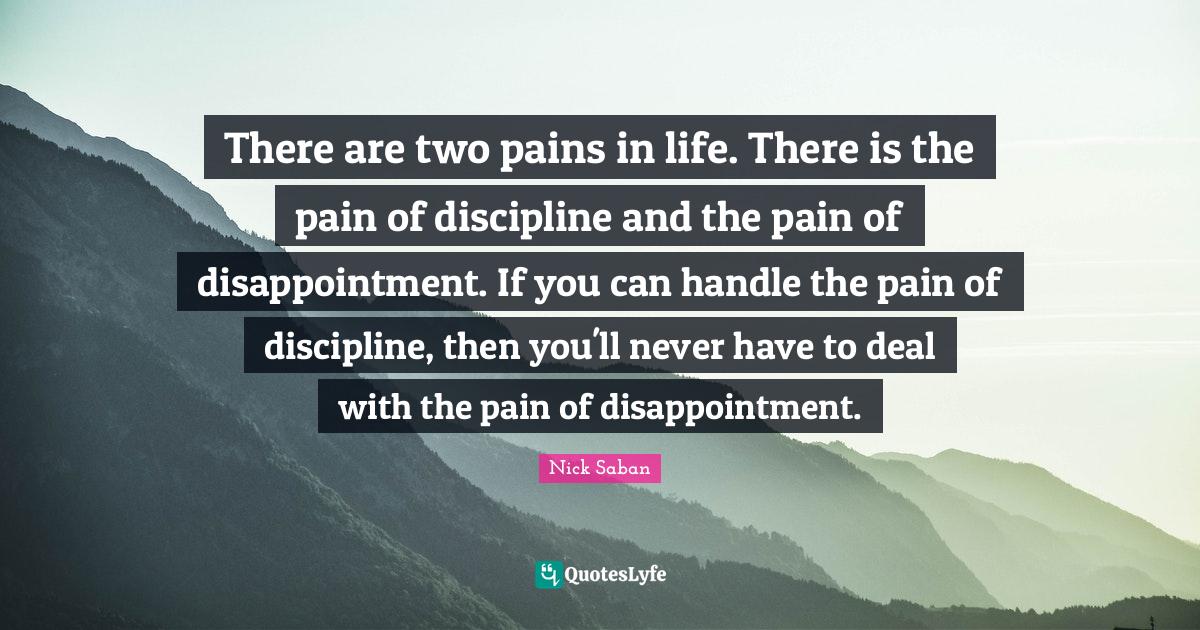 This page presents the quote "There are two pains in life. There is the pain of discipline and the pain of disappointment. If you can handle the pain of discipline, then you'll never have to deal with the pain of disappointment.". Author of this quote is Nick Saban. This quote is about two, life, discipline, disappointment, pain, handle,.