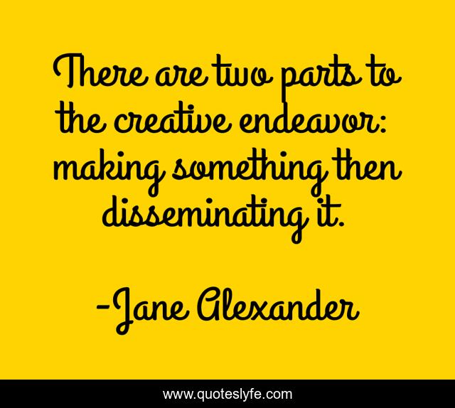 This page presents the quote "There are two parts to the creative endeavor: making something then disseminating it.". Author of this quote is Jane Alexander. This quote is about , pressure, diamonds,.