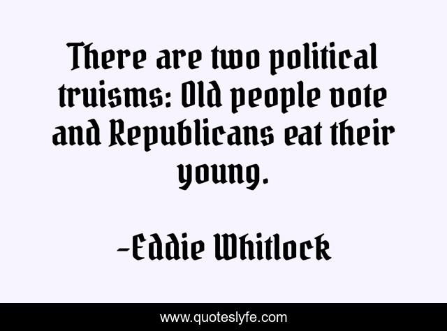 This page presents the quote "There are two political truisms: Old people vote and Republicans eat their young.". Author of this quote is Eddie Whitlock. This quote is about politics, republicans, voting,.