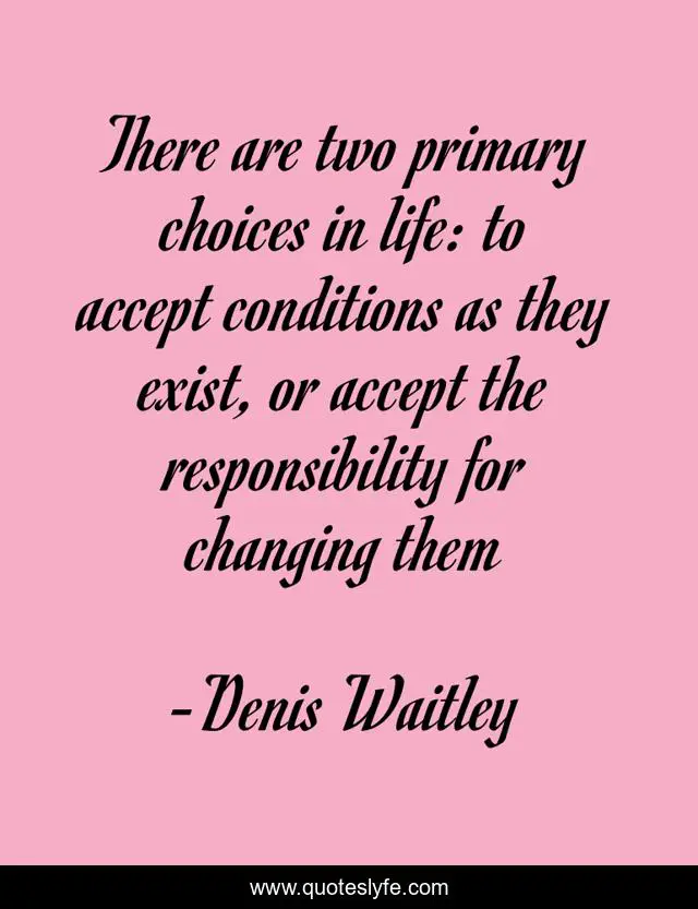 This page presents the quote "There are two primary choices in life: to accept conditions as they exist, or accept the responsibility for changing them". Author of this quote is Denis Waitley. This quote is about life, choices,.