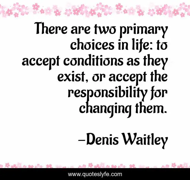 This page presents the quote "There are two primary choices in life: to accept conditions as they exist, or accept the responsibility for changing them.". Author of this quote is Denis Waitley. This quote is about responsibility, choices,.