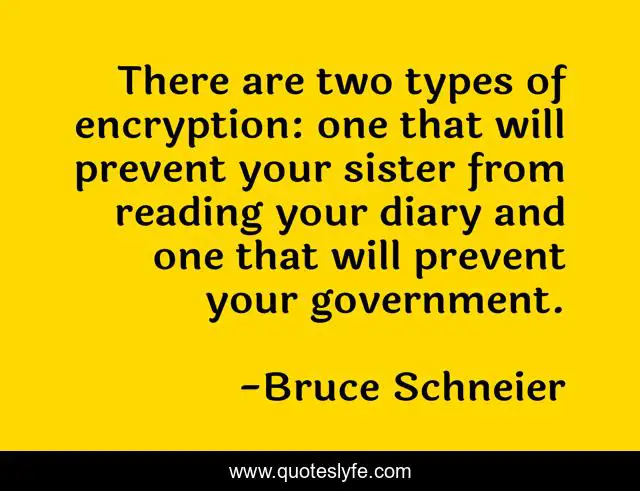 This page presents the quote "There are two types of encryption: one that will prevent your sister from reading your diary and one that will prevent your government.". Author of this quote is Bruce Schneier. This quote is about sister, reading, two,.