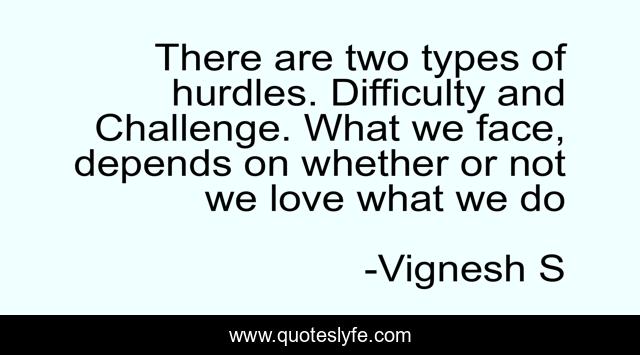 This page presents the quote "There are two types of hurdles. Difficulty and Challenge. What we face, depends on whether or not we love what we do". Author of this quote is Vignesh S. This quote is about challenges, difficulty, challenge, hurdles, love-what-you-do,.