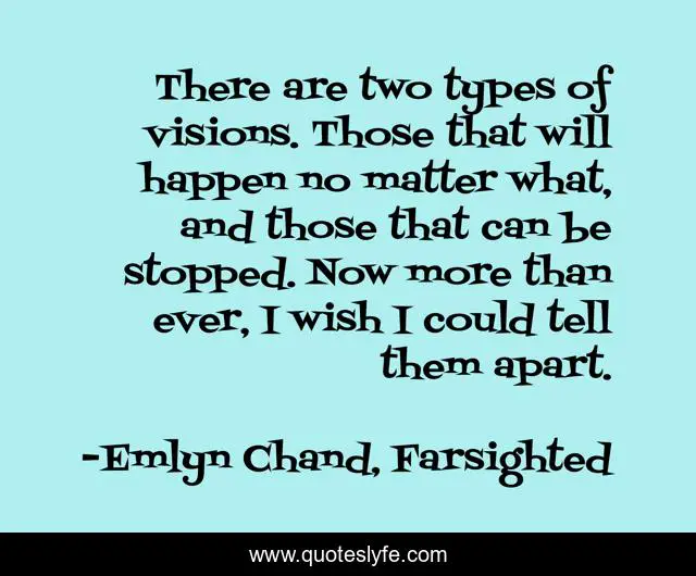 This page presents the quote "There are two types of visions. Those that will happen no matter what, and those that can be stopped. Now more than ever, I wish I could tell them apart.". Author of this quote is Emlyn Chand, Farsighted. This quote is about mystery, psychic-powers, danger, ya, paranormal, future,.