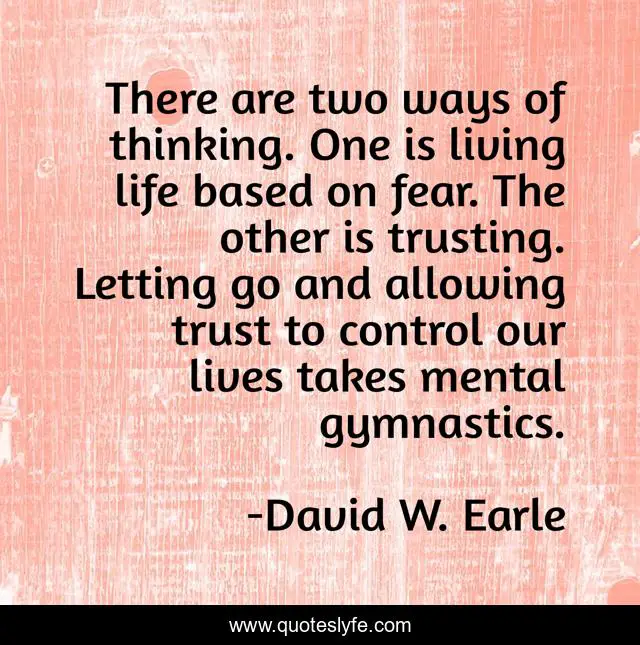 This page presents the quote "There are two ways of thinking. One is living life based on fear. The other is trusting. Letting go and allowing trust to control our lives takes mental gymnastics.". Author of this quote is David W. Earle. This quote is about letting-go, spirituality, fear, trust, recovery,.