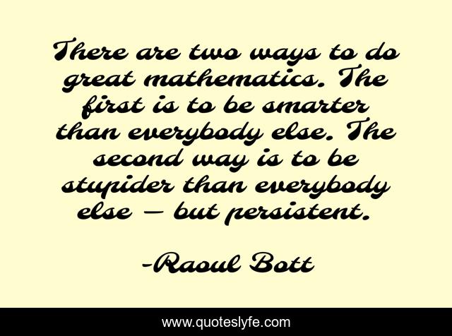 This page presents the quote "There are two ways to do great mathematics. The first is to be smarter than everybody else. The second way is to be stupider than everybody else — but persistent.". Author of this quote is Raoul Bott. This quote is about mathematics, persistence,.