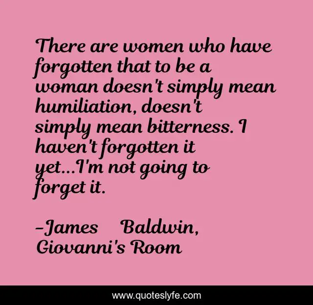 This page presents the quote "There are women who have forgotten that to be a woman doesn't simply mean humiliation, doesn't simply mean bitterness. I haven't forgotten it yet...I'm not going to forget it.". Author of this quote is James Baldwin, Giovanni's Room. .