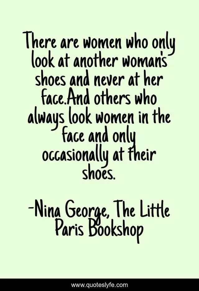 This page presents the quote "There are women who only look at another woman's shoes and never at her face.And others who always look women in the face and only occasionally at their shoes.". Author of this quote is Nina George, The Little Paris Bookshop. This quote is about real-people, shoes, appearances, shallow, real-faces, faces, women,.