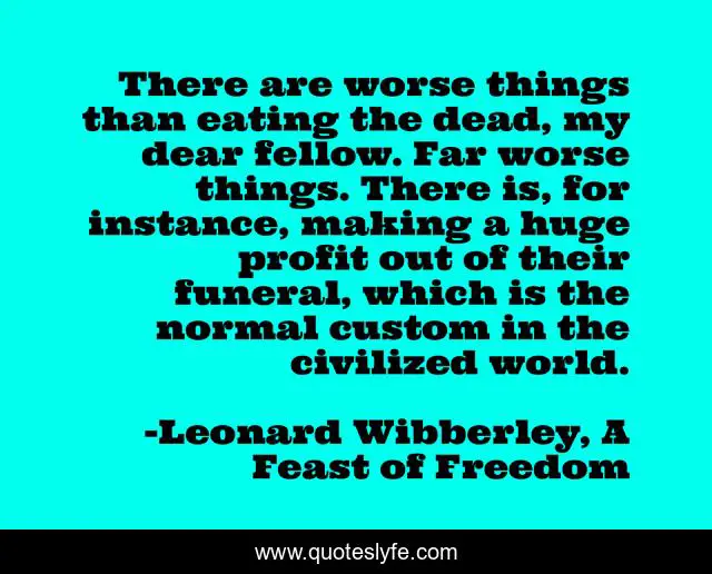 This page presents the quote "There are worse things than eating the dead, my dear fellow. Far worse things. There is, for instance, making a huge profit out of their funeral, which is the normal custom in the civilized world.". Author of this quote is Leonard Wibberley, A Feast of Freedom. This quote is about humorous, religion, satire,.