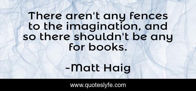 This page presents the quote "There aren't any fences to the imagination, and so there shouldn't be any for books.". Author of this quote is Matt Haig. This quote is about books, fences,.