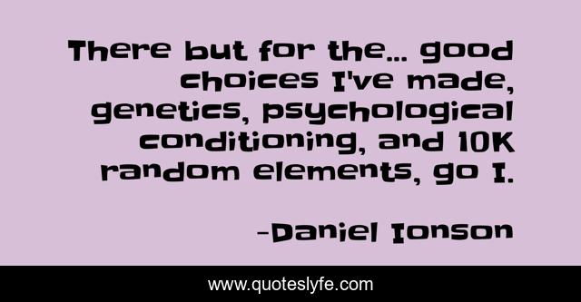 This page presents the quote "There but for the... good choices I've made, genetics, psychological conditioning, and 10K random elements, go I.". Author of this quote is Daniel Ionson. This quote is about destiny, fate,.