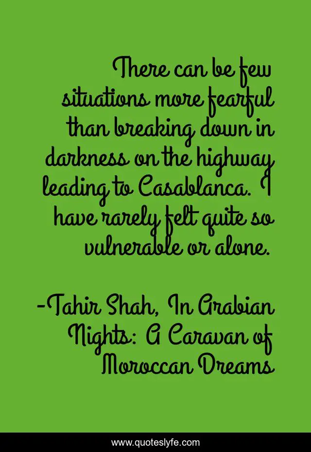 This page presents the quote "There can be few situations more fearful than breaking down in darkness on the highway leading to Casablanca. I have rarely felt quite so vulnerable or alone.". Author of this quote is Tahir Shah, In Arabian Nights: A Caravan of Moroccan Dreams. This quote is about fear, vulnerability, darkness,.