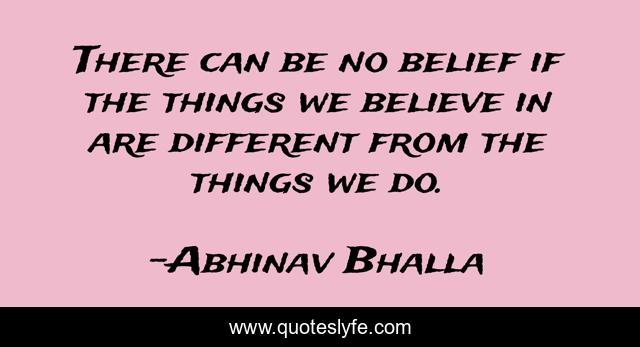 This page presents the quote "There can be no belief if the things we believe in are different from the things we do.". Author of this quote is Abhinav Bhalla. This quote is about abundance, life, belief, success, law-of-attraction, motivation, wisdom, law-of-abundance, inspiration,.