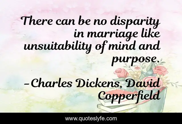 This page presents the quote "There can be no disparity in marriage like unsuitability of mind and purpose.". Author of this quote is Charles Dickens, David Copperfield. This quote is about matches, matrimony, mind, disparity, marriage, purpose, suitability, unhappiness,.