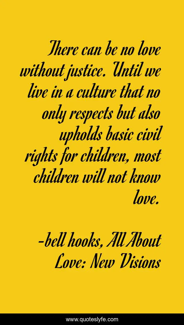This page presents the quote "There can be no love without justice. Until we live in a culture that no only respects but also upholds basic civil rights for children, most children will not know love.". Author of this quote is bell hooks, All About Love: New Visions. This quote is about child-abuse, justice, love, children, affection,.