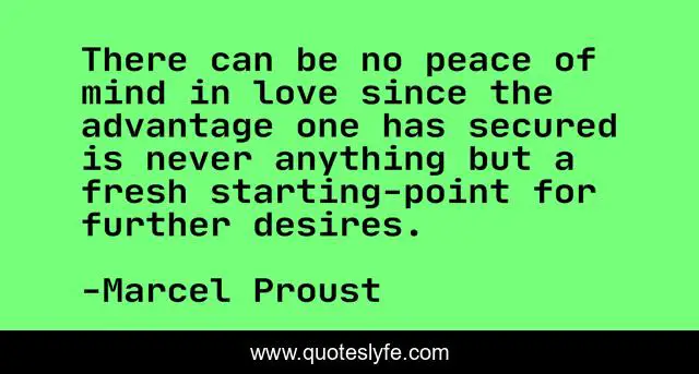 This page presents the quote "There can be no peace of mind in love since the advantage one has secured is never anything but a fresh starting-point for further desires.". Author of this quote is Marcel Proust. This quote is about love, affection,.