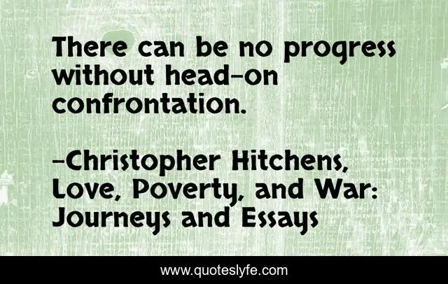 This page presents the quote "There can be no progress without head-on confrontation.". Author of this quote is Christopher Hitchens, Love, Poverty, and War: Journeys and Essays. This quote is about progress, argument, confrontation,.