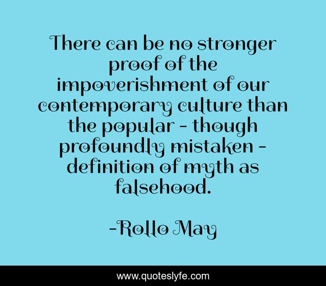 This page presents the quote "There can be no stronger proof of the impoverishment of our contemporary culture than the popular - though profoundly mistaken - definition of myth as falsehood.". Author of this quote is Rollo May. This quote is about existentialism, myth,.