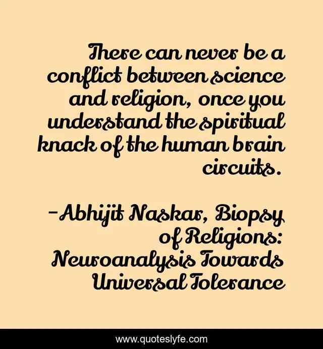 This page presents the quote "There can never be a conflict between science and religion, once you understand the spiritual knack of the human brain circuits.". Author of this quote is Abhijit Naskar, Biopsy of Religions: Neuroanalysis Towards Universal Tolerance. This quote is about brainy, consciousness, neurobiology, spirituality, science, mind, religious-tolerance, religions, brain,.