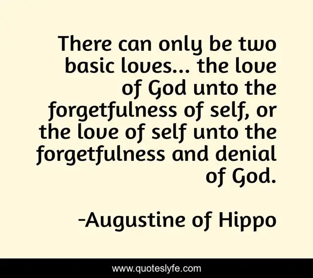 This page presents the quote "There can only be two basic loves... the love of God unto the forgetfulness of self, or the love of self unto the forgetfulness and denial of God.". Author of this quote is Augustine of Hippo. This quote is about faith, love, god, self, christianity, affection,.