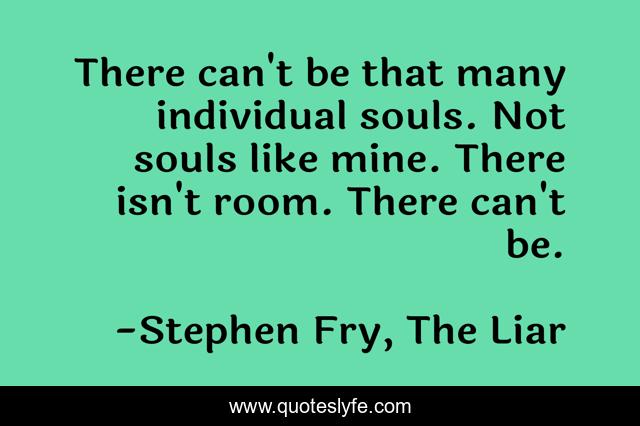 This page presents the quote "There can't be that many individual souls. Not souls like mine. There isn't room. There can't be.". Author of this quote is Stephen Fry, The Liar. This quote is about individuality, personal, soul, the-liar, individual, fry,.