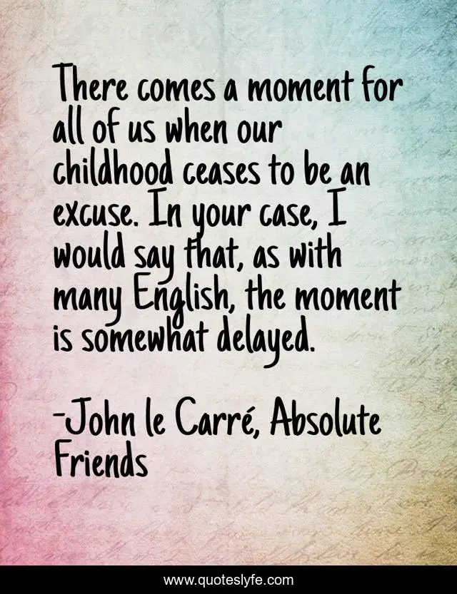 This page presents the quote "There comes a moment for all of us when our childhood ceases to be an excuse. In your case, I would say that, as with many English, the moment is somewhat delayed.". Author of this quote is John le Carré, Absolute Friends. This quote is about englishmen, england, childhood, english,.