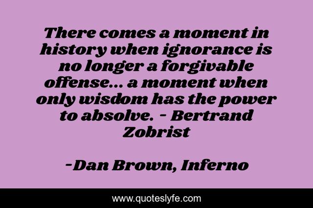 This page presents the quote "There comes a moment in history when ignorance is no longer a forgivable offense... a moment when only wisdom has the power to absolve. - Bertrand Zobrist". Author of this quote is Dan Brown, Inferno. This quote is about history, ignorance, power, wisdom,.