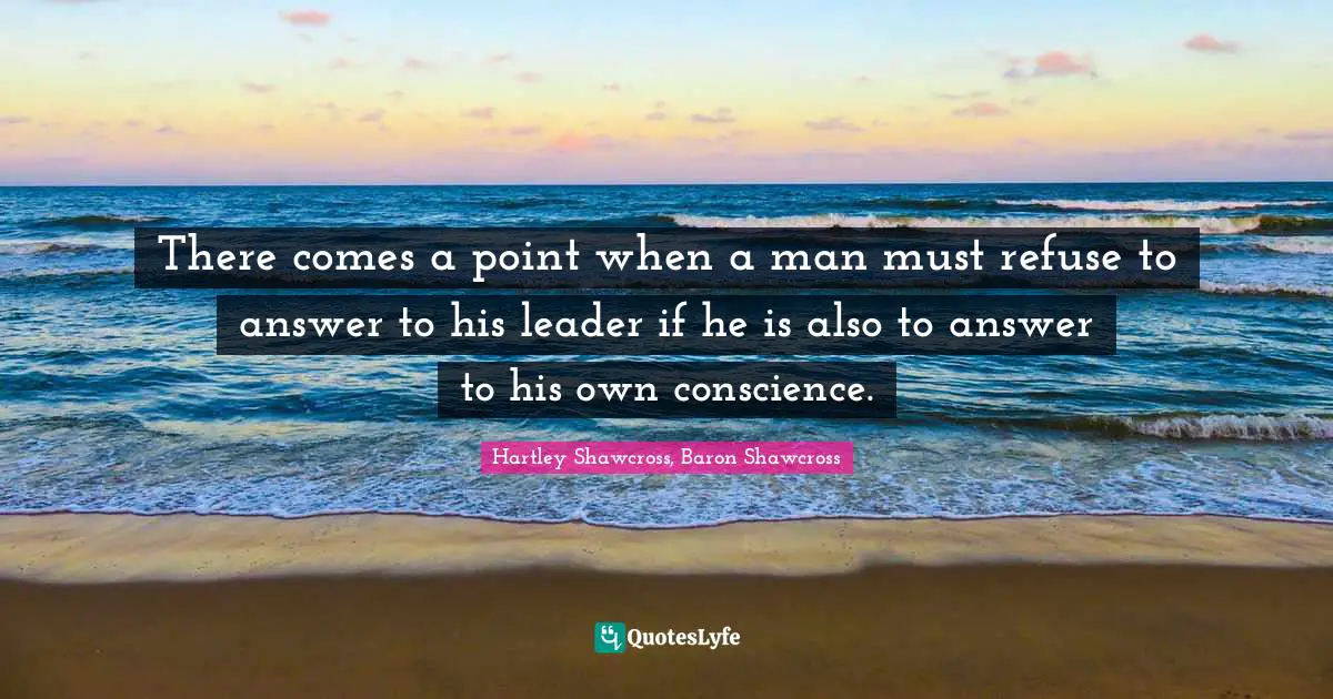 This page presents the quote "There comes a point when a man must refuse to answer to his leader if he is also to answer to his own conscience.". Author of this quote is Hartley Shawcross, Baron Shawcross. This quote is about leader, conscience, men, refuse, answers, leadership,.