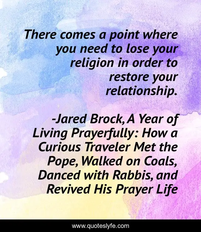 This page presents the quote "There comes a point where you need to lose your religion in order to restore your relationship.". Author of this quote is Jared Brock, A Year of Living Prayerfully: How a Curious Traveler Met the Pope, Walked on Coals, Danced with Rabbis, and Revived His Prayer Life. This quote is about christian-faith, prayer-life, relationship, prayers, pray, christianity, religion, christian-living, prayer,.