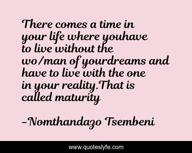 This page presents the quote "There comes a time in your life where youhave to live without the wo/man of yourdreams and have to live with the one in your reality.That is called maturity". Author of this quote is Nomthandazo Tsembeni. This quote is about maturity, life, love, dreams, affection,.