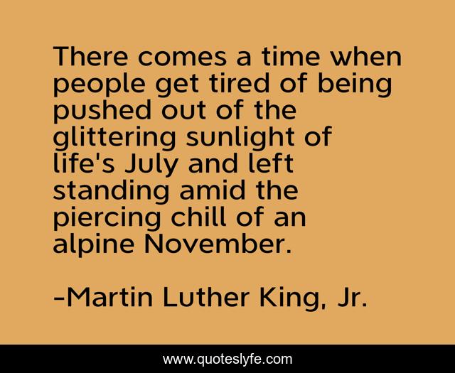 This page presents the quote "There comes a time when people get tired of being pushed out of the glittering sunlight of life's July and left standing amid the piercing chill of an alpine November.". Author of this quote is Martin Luther King, Jr.. This quote is about life, tired, people,.