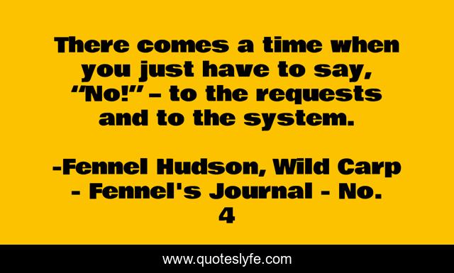 This page presents the quote "There comes a time when you just have to say, “No!” – to the requests and to the system.". Author of this quote is Fennel Hudson, Wild Carp - Fennel's Journal - No. 4. This quote is about breakdown, work-life-balance, stress, self-belief, life-purpose, identity,.