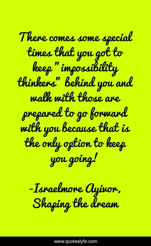 This page presents the quote "There comes some special times that you got to keep "impossibility thinkers" behind you and walk with those are prepared to go forward with you because that is the only option to keep you going!". Author of this quote is Israelmore Ayivor, Shaping the dream. This quote is about keep-going, food-for-thought, companionship, prepare, negative-people, friends, impossibility-thinkers, companions, behind,.