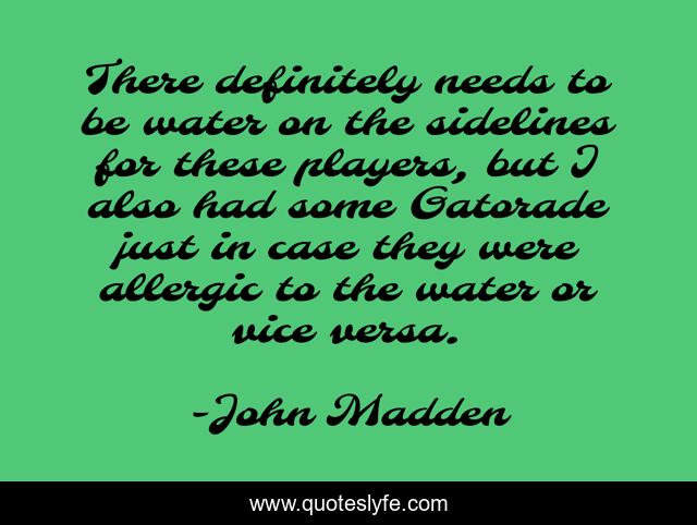 This page presents the quote "There definitely needs to be water on the sidelines for these players, but I also had some Gatorade just in case they were allergic to the water or vice versa.". Author of this quote is John Madden. This quote is about water, players, football, gatorade,.