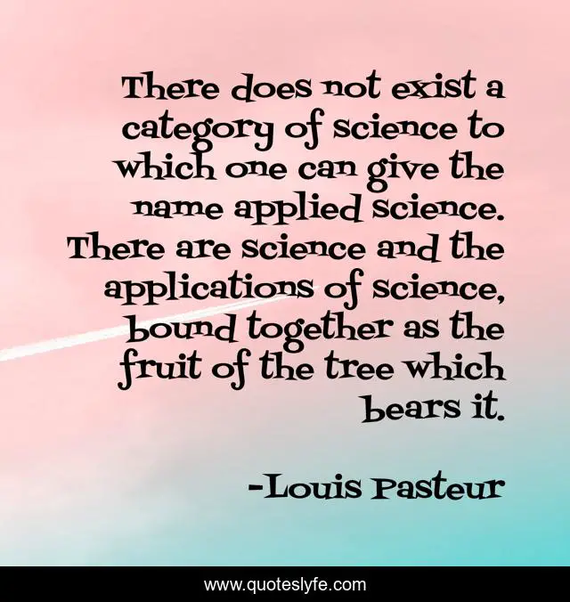 This page presents the quote "There does not exist a category of science to which one can give the name applied science. There are science and the applications of science, bound together as the fruit of the tree which bears it.". Author of this quote is Louis Pasteur. This quote is about fruit, tree, together,.