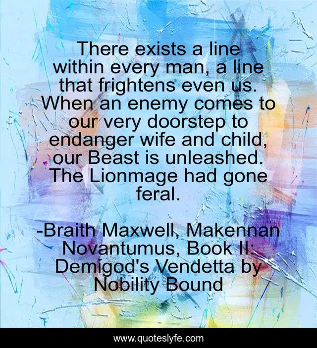 This page presents the quote "There exists a line within every man, a line that frightens even us. When an enemy comes to our very doorstep to endanger wife and child, our Beast is unleashed. The Lionmage had gone feral.". Author of this quote is Braith Maxwell, Makennan Novantumus, Book II: Demigod's Vendetta by Nobility Bound. This quote is about life, love, fantasy, war, affection, philosphy,.
