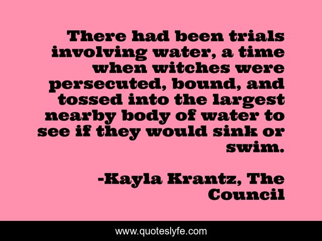This page presents the quote "There had been trials involving water, a time when witches were persecuted, bound, and tossed into the largest nearby body of water to see if they would sink or swim.". Author of this quote is Kayla Krantz, The Council. This quote is about magic, witches,.