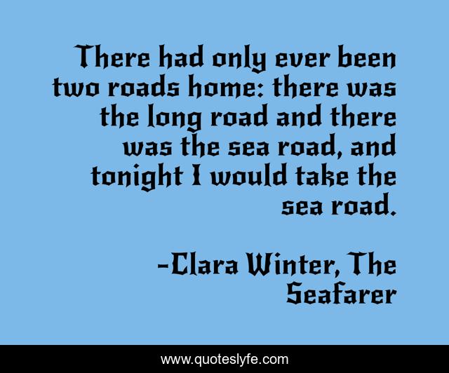 This page presents the quote "There had only ever been two roads home: there was the long road and there was the sea road, and tonight I would take the sea road.". Author of this quote is Clara Winter, The Seafarer. This quote is about home, road, sea, seafarer,.