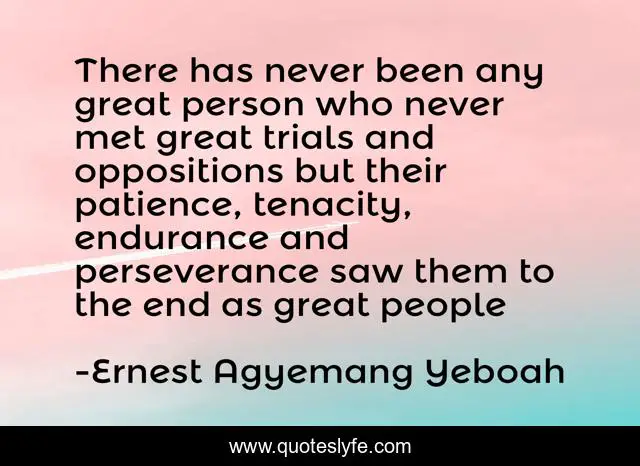 This page presents the quote "There has never been any great person who never met great trials and oppositions but their patience, tenacity, endurance and perseverance saw them to the end as great people". Author of this quote is Ernest Agyemang Yeboah. This quote is about perseverance, fortitude, success, greatness-in-you, trials, endurance, greatness, behaviour, attitude,.