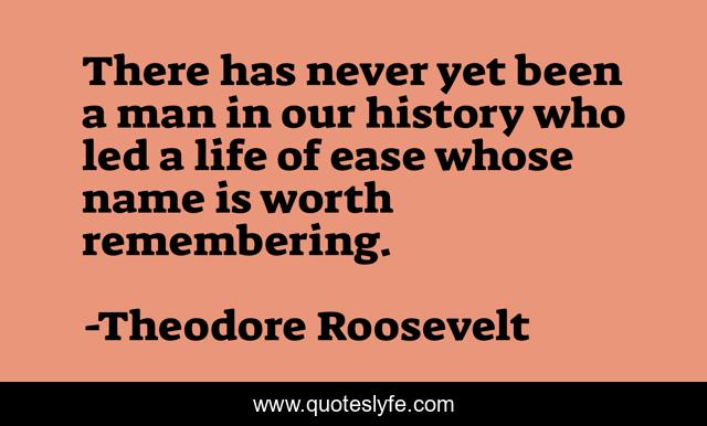 This page presents the quote "There has never yet been a man in our history who led a life of ease whose name is worth remembering.". Author of this quote is Theodore Roosevelt. This quote is about life, name, man,.