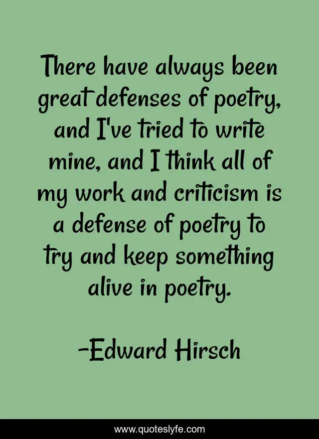 This page presents the quote "There have always been great defenses of poetry, and I've tried to write mine, and I think all of my work and criticism is a defense of poetry to try and keep something alive in poetry.". Author of this quote is Edward Hirsch. This quote is about great, work, think,.