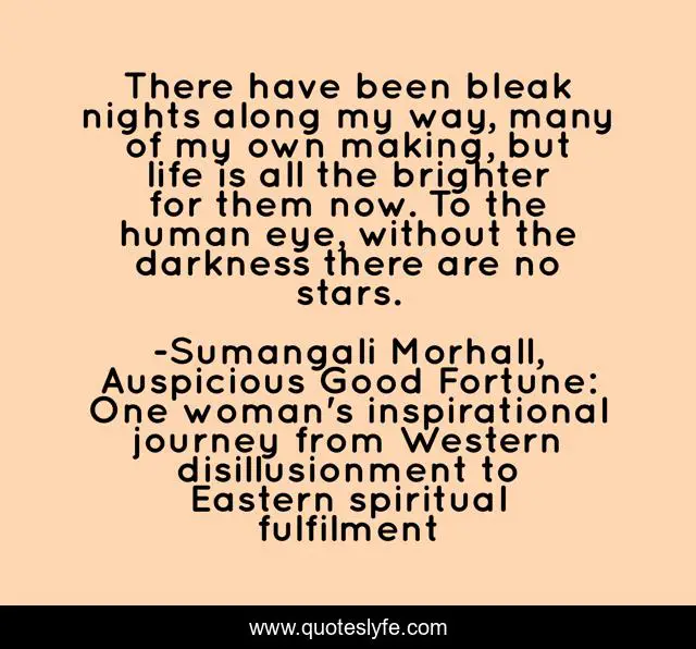 "Sumangali Morhall, Auspicious Good Fortune: One woman's inspirational journey from Western disillusionment to Eastern spiritual fulfilment Quotes." Quoteslyfe.com, 2025. Fri. 05 Dec. 2025. <https://www.quoteslyfe.com/quote/There-have-been-bleak-nights-along-my-19625>.