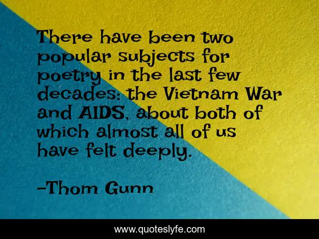 This page presents the quote "There have been two popular subjects for poetry in the last few decades: the Vietnam War and AIDS, about both of which almost all of us have felt deeply.". Author of this quote is Thom Gunn. This quote is about vietnam war, vietnam, poetry,.