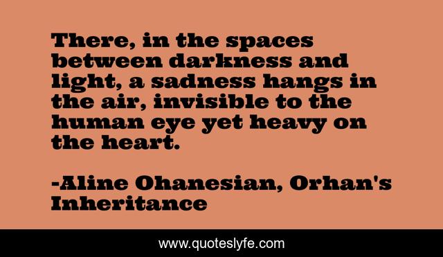 This page presents the quote "There, in the spaces between darkness and light, a sadness hangs in the air, invisible to the human eye yet heavy on the heart.". Author of this quote is Aline Ohanesian, Orhan's Inheritance. This quote is about life, sadness,.