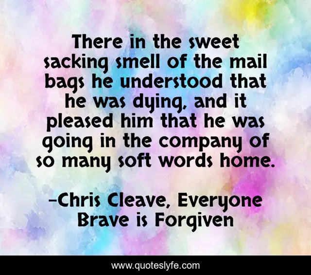 This page presents the quote "There in the sweet sacking smell of the mail bags he understood that he was dying, and it pleased him that he was going in the company of so many soft words home.". Author of this quote is Chris Cleave, Everyone Brave is Forgiven. This quote is about world-war-two, death, war,.