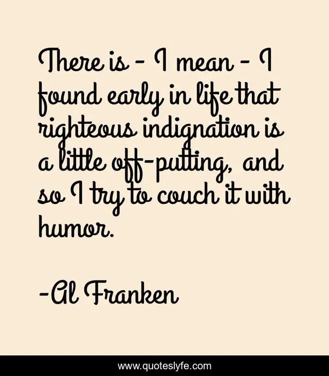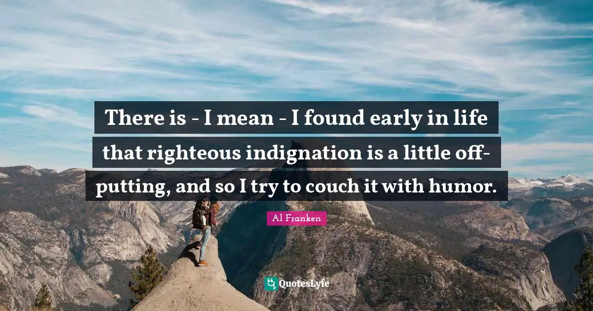 This page presents the quote "There is - I mean - I found early in life that righteous indignation is a little off-putting, and so I try to couch it with humor.". Author of this quote is Al Franken. This quote is about early, try, life,.