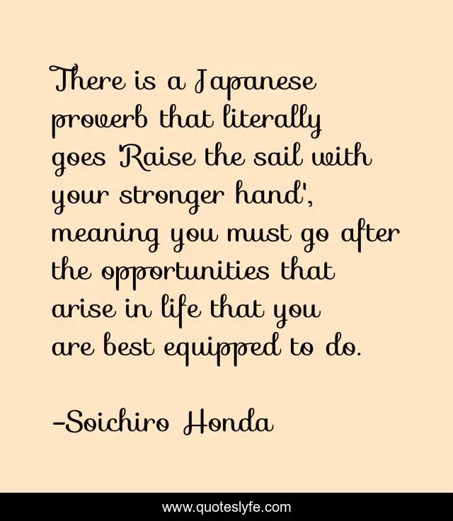This page presents the quote "There is a Japanese proverb that literally goes 'Raise the sail with your stronger hand', meaning you must go after the opportunities that arise in life that you are best equipped to do.". Author of this quote is Soichiro Honda. This quote is about life, opportunities,.