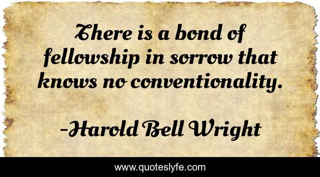 This page presents the quote "There is a bond of fellowship in sorrow that knows no conventionality.". Author of this quote is Harold Bell Wright. This quote is about fellow-man, fellowship, sorrow, bond,.