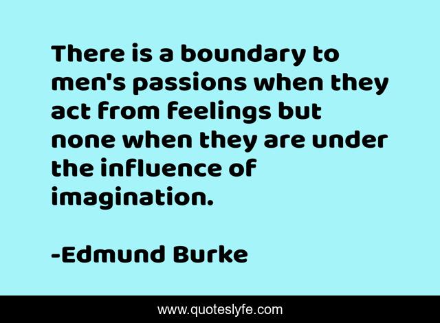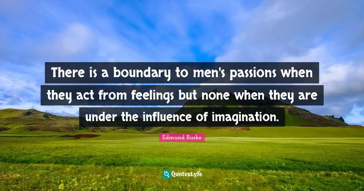 This page presents the quote "There is a boundary to men's passions when they act from feelings but none when they are under the influence of imagination.". Author of this quote is Edmund Burke. This quote is about men, influence, feelings,.